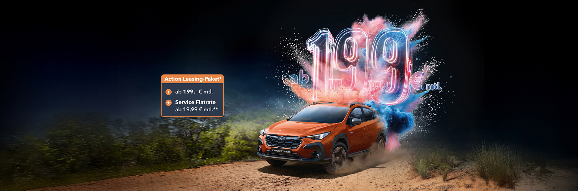 1 Die Aktion gilt vom 01.10.2025 bis 31.12.2025 in Verbindung mit dem Leasing eines aktuellen Subaru Crosstrek (Modelljahr 2024) (Neu- oder Vorführwagen), Zulassung/Besitzumschreibung bis 31.12.2025 bei teilnehmenden Subaru Partnern. Die Aktion wird von der SUBARU Deutschland GmbH getragen und ist nicht mit anderen Aktionen der SUBARU Deutschland GmbH kombinierbar mit Ausnahme des Aktionsangebots zur Service-Flatrate. Weitere Detailinformationen erhalten Sie bei Ihrem teilnehmenden Subaru Partner oder unter www.subaru.de. Subaru Crosstrek MJ24 Trend Leasingbeispiel (gültig bis 31.12.2025): Anzahlung 2875,00 EUR, monatliche Rate 199 EUR, Laufzeit 24 Monate, Laufleistung p. a. 5000 km, zzgl. Überführungskosten 1578,24 EUR, Gesamtpreis (inkl. Überführungskosten) 49555,99 EUR, Freibleibendes Leasingangebot der SUBARU Finance, Ein Service der MCE Bank GmbH, Schieferstein 9, 65439 Flörsheim. Alle Preise verstehen sich inkl. Umsatzsteuer.