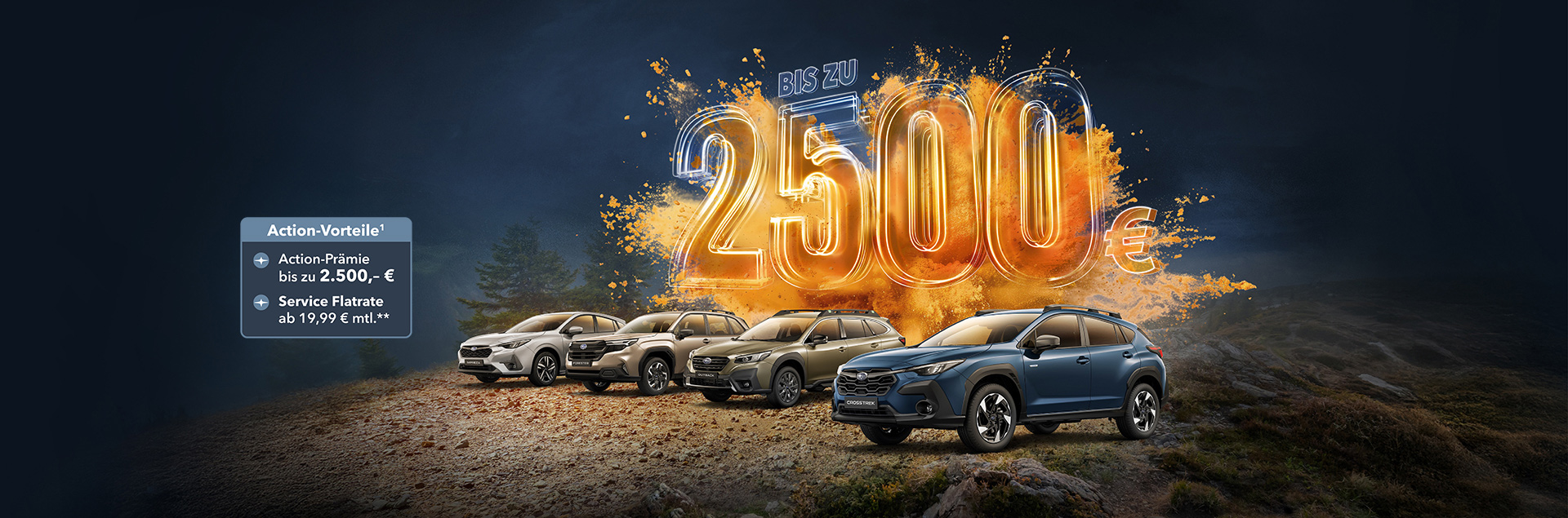 1 Die Aktion gilt vom 01.10.2025 bis 31.12.2025 in Verbindung mit dem Kauf eines aktuellen Subaru Impreza, Crosstrek, Outback oder neuen Forester (Modelljahr 2025) (Neu- oder Vorführwagen), Zulassung/Besitzumschreibung bis 31.12.2025 bei teilnehmenden Subaru Partnern. Die Aktion wird gemeinsam von der SUBARU Deutschland GmbH und den teilnehmenden Subaru Partnern getragen und ist nicht mit anderen Aktionen der SUBARU Deutschland GmbH kombinierbar mit Ausnahme des Aktionsangebots zur Service-Flatrate. Sie sparen je nach Modell bei Kauf eines Subaru Crosstrek oder Impreza (MJ 2024): 2.500,-€, eines Crosstrek oder Impreza (MJ 2025): 1.200,-€, eines Outback (MJ 2024): 1.000,-€; eines Outback (MJ 2025): 2.000,-€, oder eines neuen Forester (MJ 2025): 1.000,-€. Weitere Detailinformationen erhalten Sie bei Ihrem teilnehmenden Subaru Partner oder unter www.subaru.de.